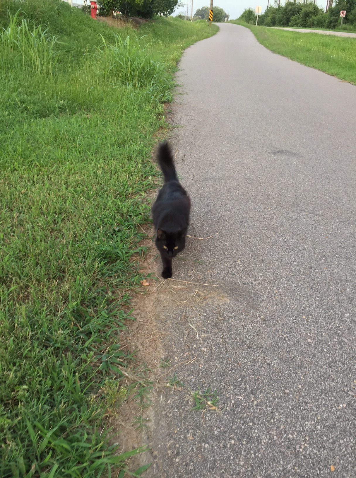 We emptied my Dad’s garage of cars and opened up the cage. Midnight explored her surroundings. She was very nervous but clearly enjoyed being around people. I hadn’t noticed it before, but there was an obvious “collar mark” in her fur from wearing a collar full time in her previous life. Where did this little girl come from? The next day a vet confirmed that she was already spayed. Again, take that Animal Control officer! This cat is “definitely not tame”? I challenge you to throw any cat into Midnight’s situation and they will act crazy. I felt vindicated on all levels. The more I hung out with her, I realized that she – as many cats do – communicated with her bites. I am convinced that her break-the-skin-bite to my leg on the greenway was definitely a “PLEASE DON’T LEAVE ME HERE” bite – and I’m so glad I didn’t.