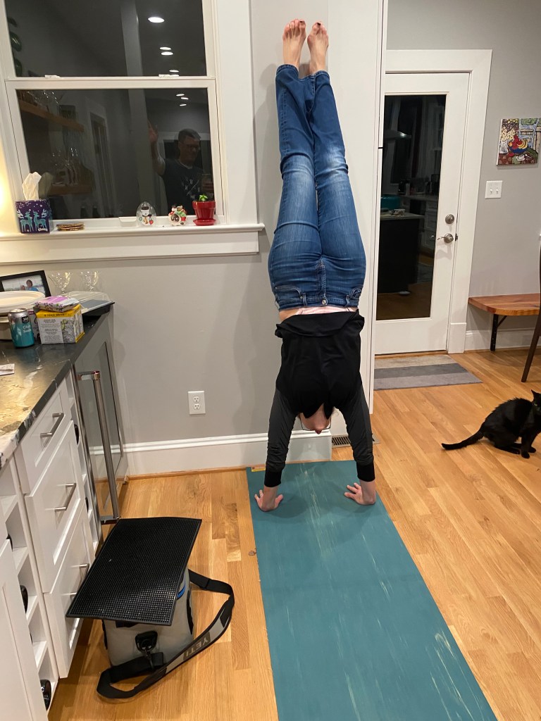 I made it to August 9th when I had to stop.  A sharp neck pain very likely due to the previous 220 handstands, and always using the same leg to kick up with, had set in. I got treatment and waited, but it was persistent. I reminded my inner perfectionist that this wasn’t the Olympics, that I hadn’t been training my whole life for this, and that I didn’t need to fight through the pain. My inner perfectionist replied, “Fine.” But then cataloged this as a failure and added it to that non-followed-through-on list. But then the kinder, confident, stronger part of me spoke up reminded me that I make the rules and I define the success criteria. It said, “Hey, 221 handstands ain’t nothin’.” It reminded me that in 2022 I faced the latent grief of losing my father the previous year. That I changed roles at work three times while discovering that burnout is real. That I lost a healthy, strong, vibrant peer to cancer. I lost my beloved 96-year-old powerhouse mother-in-law who I only had the pleasure of knowing in her 90’s. I buried my beloved 17-year-old kitty, and we unexpectedly rescued a tiny new kitten and named her Ruby. It reminded me that I got covid for the first time in August, celebrated my 52nd birthday in September, AND I did 221 handstands in 2022. I’m going to call it a win.