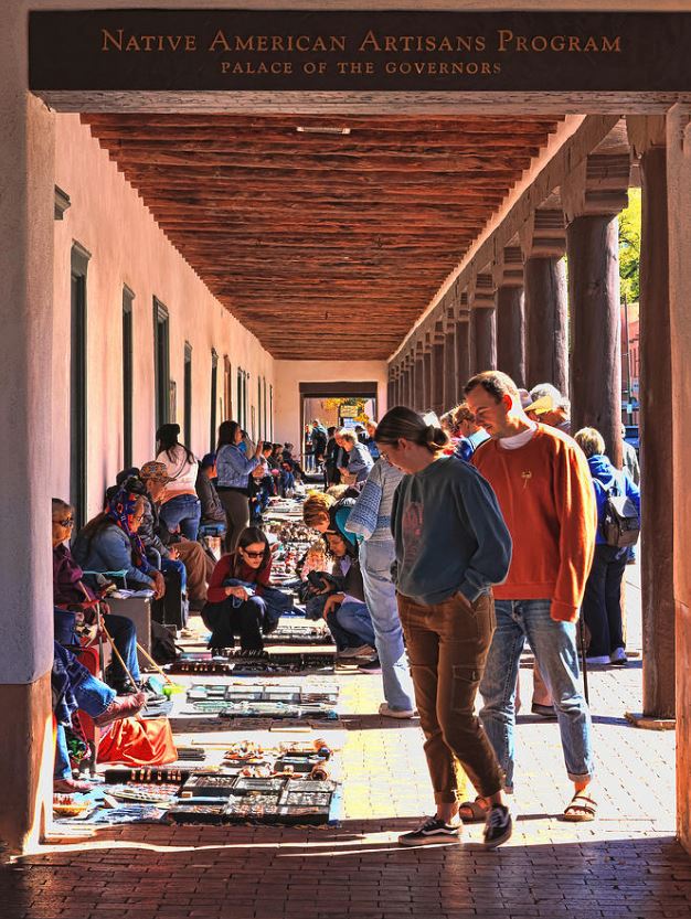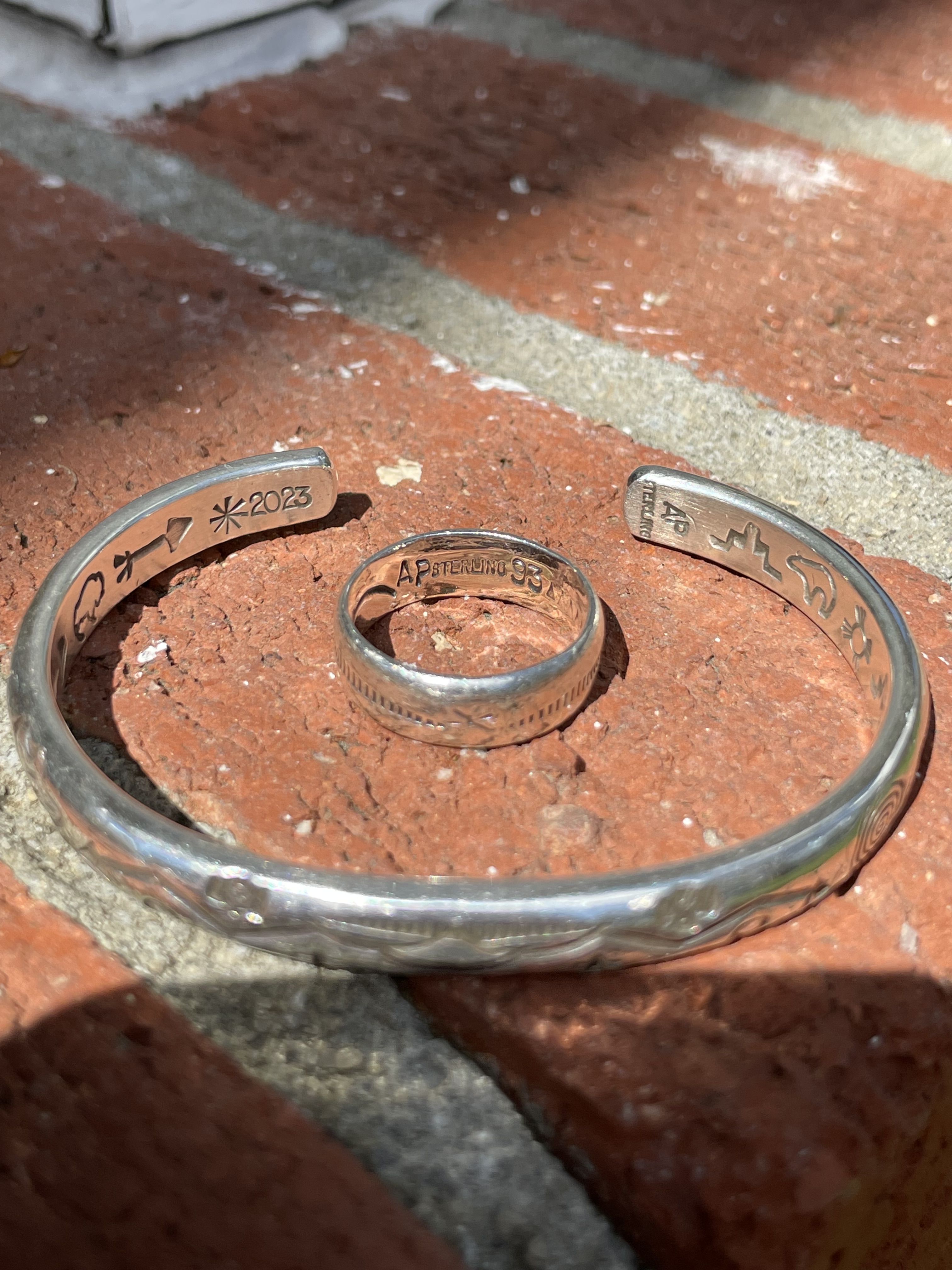 I easily found the jewelry market in the Santa Fe Plaza the first Sunday I was in town. I was overcome with how little had changed compared to my memories. Here it was, a long row of Native American artists seated behind blankets displaying their work. I learned that this location, the Palace of the Governors, is part of the New Mexico History Museum and has protected Native American artists selling their handmade artwork since 1979. The Artisans Portal Program ensures that only Native Americans sell their goods here. While I knew it was a long shot, it occurred to me that I might be able to find the 1993 artist. As I took it all in, walking down the line, I kept an eye out for any rings with designs on the inside. I spoke to a woman who had been selling her jewelry there since the 90’s. Hopeful, I showed her my ring. The design inside the band wasn’t the clue I’d hoped it would be. She did, however, point out that initials and a year were inscribed in small print alongside the designs. I was stunned. After so many years, I’d looked right past the small “AP sterling 93.” I thanked her, bought a pair of her earrings, and returned to my search. I retraced my steps studying business cards and jewelry signatures before continuing down the line. No “AP” or rings with designs inside the band to be found.