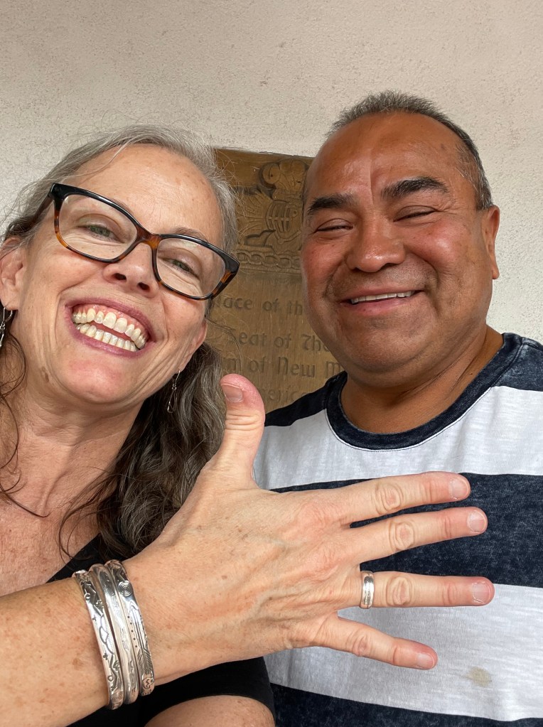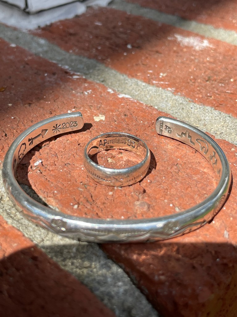 I fell asleep that last night still trying to pull up details from three decades earlier, but so grateful that I’d filled in some of the blanks. The next morning, I loaded up my rental car and headed to the Plaza one more time before driving to the airport in Albuquerque. The Saturday buzz of the market was noticeably different from the cleaned-out, Sunday afternoon vibe of the previous weekend. I was looking for gifts while keeping an eye out for AP. I slowly moved down the line, weaving through fellow shoppers, checking every blanket. Running out of time, I stopped in front of a middle-aged guy with a sparse selection. Kneeling, I picked up a bracelet. Inside there was an inscription, “AP 2023.” I practically yelled, “YOU’RE AP!? I’VE BEEN LOOKING FOR YOU.” Caught off guard by my emotions (he probably felt the same), I held out my hand. “I bought this from you in 1993, over there,” pointing to the end of the line. He smiled, “That does look like my work. I was a lot younger in 1993.” I laughed, “Me too,” guessing we’re similar in age. I told him about my dad, the two trips, and how much I’d enjoyed the ring. His name is Allen Bruce Paquin. He’s affiliated with the Walatowa (Jemez Pueblo), Zuni, Laguna, and Acoma tribes and has been selling jewelry there since the 90’s. He was very gracious when I asked to take a photo with him. I bought two silver bracelets with beautiful designs on the inside and out, signed “AP 2023” – one for me, and one for my sister. The whole transaction took less than 10 minutes, just like before. This time, the significance of the moment was not lost on me. I smile every time I wear my new AP bracelet. It feels like another gift from dad.